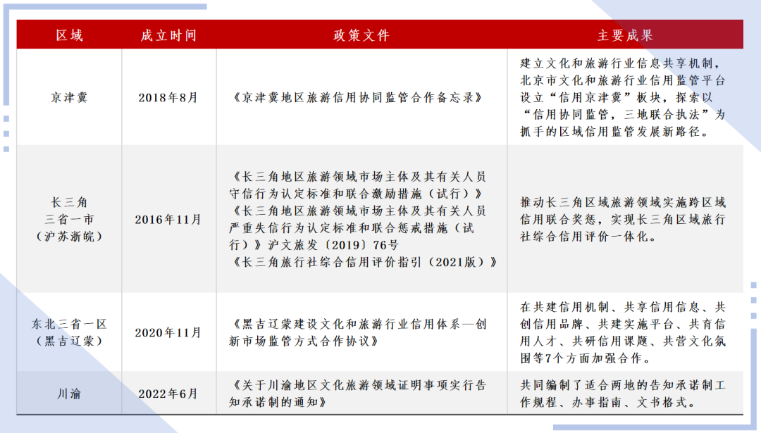 二是区域信用协同监管走实走深。经过持续培育和推动,京津冀、长三角三省一市(沪苏浙皖)、东北三省一区(黑吉辽蒙)、川渝等区域文化和旅游市场信用协同监管机制不断完善,各领域合作不断深化,形成了制度性成果,对区域文化和旅游市场的监管效能逐步提升。京津冀定期召开文化和旅游市场信用监管一体化工作推进视频会,就三地市场监管、联合执法典型案例等进行深入研讨。长三角三省一市(沪苏浙皖)推进区域旅行社综合信用评价标准一体化,并将成功经验逐步推广到其他重点领域,研究制定长三角地区酒店等旅游行业价格诚信自律公约,签署《长三角文化和旅游高质量一体化发展框架协议》,一体推进长三角文化和旅游市场信用体系建设。东北三省一区(黑吉辽蒙)签订《黑吉辽蒙建设文化和旅游行业信用体系—创新市场监管方式合作协议》。川渝两地文化和旅游行政部门联合印发《关于川渝地区文化旅游领域证明事项实行告知承诺制的通知》(川文旅发〔2022〕46 号),共同编制了适合两地的告知承诺制工作规程、办事指南、文书格式。