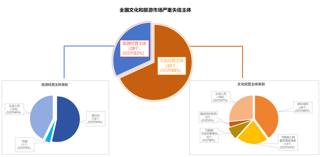 一是信用监管震慑力进一步增强。各级文化和旅游行政部门依法依规开展失信主体认定与管理工作,截至2023年7月底,江苏、福建、广东、贵州、云南等15个省份共认定文化和旅游市场失信主体123个,其中,严重失信主体88个,轻微失信主体35个。严重失信主体包括文化经营主体60个,涉及娱乐场所24家、互联网上网服务营业场所13家、互联网文化经营单位5家、演出经纪机构2家以及从业人员16名;旅游经营主体28个,涉及旅行社15家、导游1名、从业人员12名。轻微失信主体包括文化市场主体25个,涉及娱乐场所12家、互联网上网服务营业场所9家、演出场所经营单位1家、艺术品经营单位1家、从业人员2名;旅游市场主体10个,涉及旅行社9家、景区1家。轻微失信主体信用修复16家,涉及旅行社、娱乐场所、互联网上网服务营业场所等领域。严重失信主体均通过文化和旅游部政府门户网站同步公开并实施相应的管理措施,进一步增强了信用监管的震慑力。