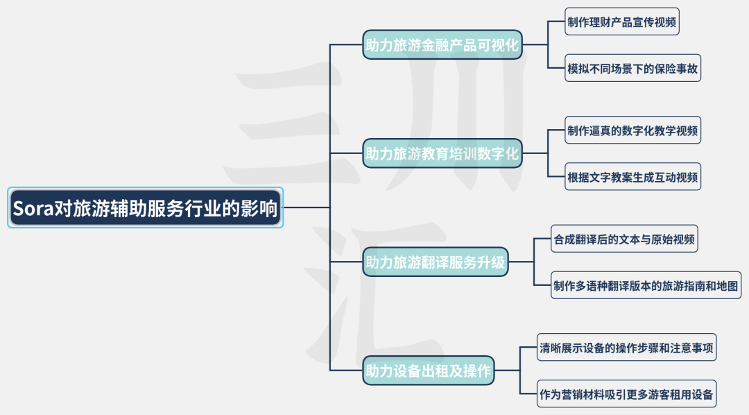 旅游辅助服务是旅游业的重要组成部分,涵盖旅游金融、教育培训、旅游翻译服务以及旅游娱乐体育设备出租等多个领域。随着 Sora的视频生成、视频合成以及图片生成技术的不断升级拓展,以上这些领域也同样也将迎来一系列潜在应用的变革。