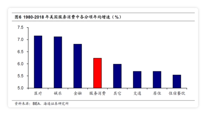 自上世纪80年代起,美国偏文化类的文旅娱乐消费常年保持7%以上的高速增长,高于偏物质类的住宿餐饮等行业,也远高于年均3-4%的GDP增速。