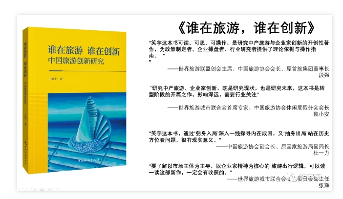 作者介绍:王笑宇研究员,世界旅游城市联合会特聘专家,中国社会科学院旅游研究中心特约研究员,旅游经济学博士后,文化和旅游部、国家体育总局专家,多个央企及省市文旅发展顾问,持续聚焦中产阶层旅游及企业家创新的理论研究及产业实践,长期负责大型文旅集团的产品开发、战略投资及一线运营实操相关工作,代表作《谁在旅游,谁在创新》、《中产阶层旅游》。