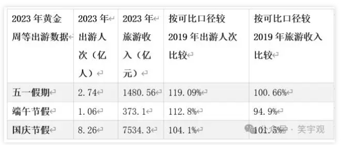 △图:2023年黄金周等出游数据与2019年比较 来源:笔者根据文化和旅游部及国家统计局官网数据绘制